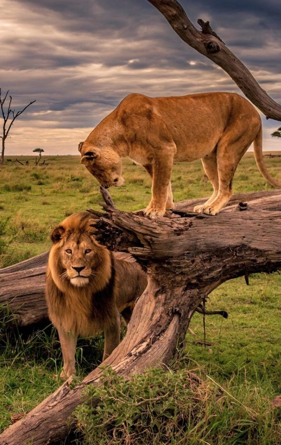 Spotting lions resting on warm rocks under a soft afternoon sky.