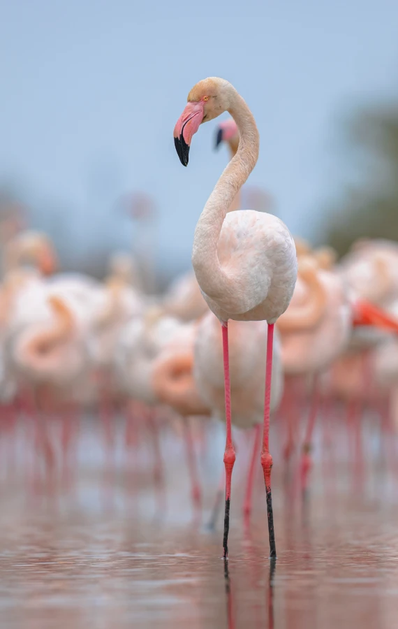 Flamingos scatter across the lake, colouring the shoreline with soft hues.