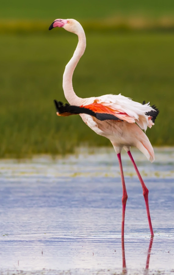 Soda lake scenes with flamingos, hippos, and peaceful water reflections.